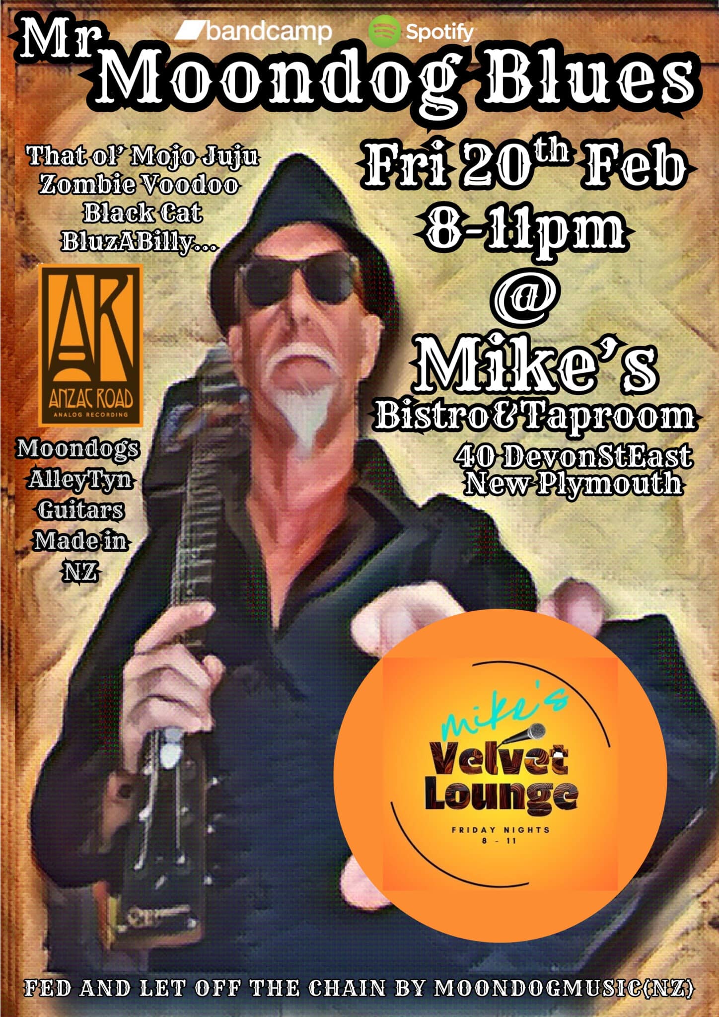 New Zealand born blues/roots musician, an enigmatic performer known simply as Moondog. Either found based out of Northland, NZ or as the gypsy bluesman touring Australia he channels a gritty, raw style — using metal-bodied guitars (homemade biscuit‑tins ‘AlleyTyns’), harmonica, a gritty and sometimes dark freight‑train voice, thumb slappin’ bass, foot-stomping rhythm — to deliver a unique blend of traditional blues, rock‑n‑roll, voodoo-infused “Bluz‑A‑Billy,” and Mojo-Juju vibes.